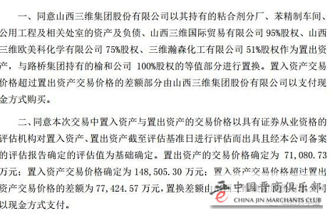 山西资本圈此前亦对上述重组方案进行了介绍,山西三维拟以其持有的粘合剂分厂、苯精制车间、公用工程及相关处室的资产及负债、三维国贸 95%股权、欧美科 75%股权、三维瀚森 51%股权作为置出资产,与间接实控人山西路桥集团持有的榆和高速 100%股权的等值部分进行置换。置出资产由路桥集团旗下的山西三维华邦集团承接,置入资产交易价格(148,505.30 万元)超过置出资产交易价格(71,080.73 万元)的差额部分(77,424.57万元)由山西三维向路桥集团以现金支付(方案敲定!山西三维置出全部化工资产+置入榆和高速 ,山西高速资产上市正式拉开序幕) 。