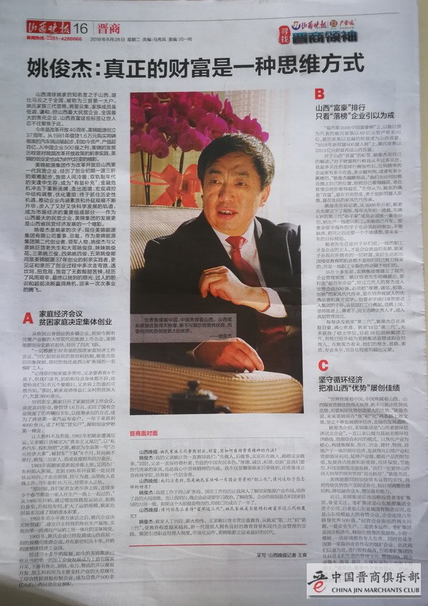对于山西“首富”的标签,姚俊杰有自己的解读。“对于财富排行榜我从不过多关注,我最多关注的是排行榜发布后,位列榜单的企业家有多少在逃、多少被判刑,或者有多少跳楼的。”姚俊杰幽默地说。“我们无论何时都应摆正自己的位置,你把自己看得越高,老百姓便会把你看得越低。”在他认为,姚家的确是“首富”,富在穷则思变、勇于创新的富人思维,富在优良的家风代代传承。