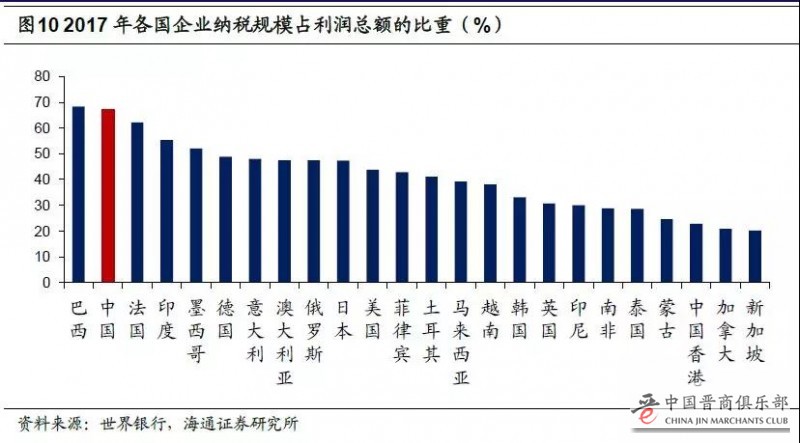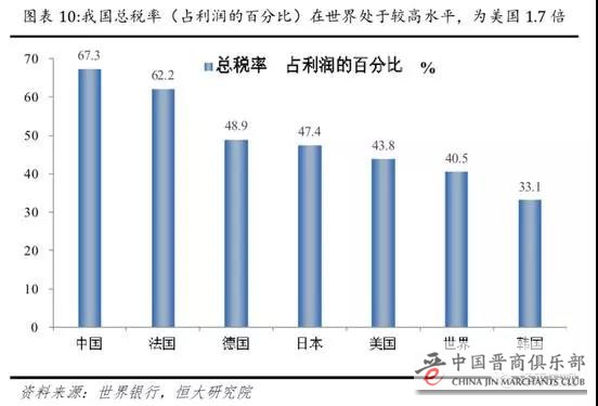 如图,中国企业总税率(占利润的百分比)为67.3%,在世界处于较高水平。远超德国日本美国韩国,也远超世界平均水平40.5%。