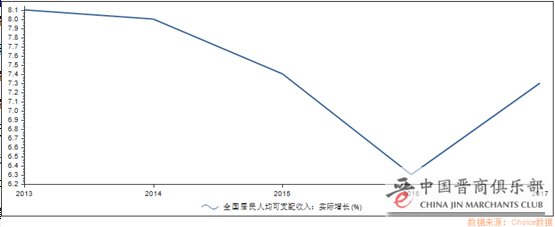 数据显示,2013年到2016年,全国居民人均可支配收入实际增长率连续3年下降,虽然2017年有所反弹,但仍没有达到前期水平。