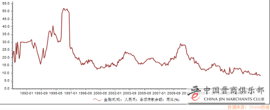 数据显示,在此之前,我国金融机构各项存款余额同比增速基本保持在10%以上。还曾经出现了两次高峰。其中,1994年~1996年我国金融机构各项存款余额的增速明显提高,并在1996年4月,同比增速达51.90%,这是我国金融机构各项存款余额增速的第一个高峰。