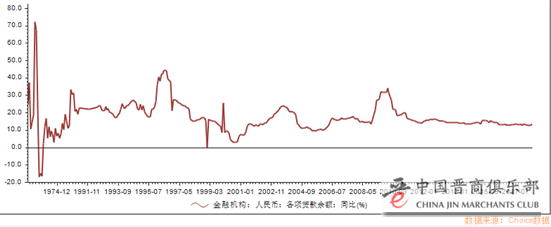 数据显示,我国金融机构各项贷款余额同比增速有5次出现过比较大的波动,第一次是在1966年以前,第2次出现在1983年12月到1984年12月之间,金融机构各项贷款余额同比增速在一年内从12.77涨至33%,此后,分别在1995年到1996年,1990年到2000年出现过大波动。