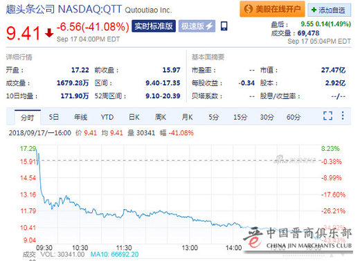 但暴涨神话仅仅一天就终结了,趣头条被打回了原形。周一,趣头条开盘价为17.22美元,较上周五收盘价15.97美元上涨7.8%,随即一路走低,当天收盘报收9.41美元,收跌41.08%。相对于最高点,市值几乎腰斩。