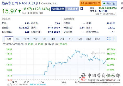 美国东部时间9月15日,趣头条登陆纳斯达克证券交易所,开盘报每股9.1美元,比7美元的发行价上涨30%,接下来半小时内由于涨幅过大多次触发熔断、市值转眼翻倍,一度飙升超过190%,股价最高触及20.39美元。