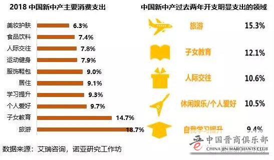根据艾瑞咨询的调研数据显示2018年中国新中产阶级的消费专注度最高的方向分别是汽车、数码、服饰、奢侈品、机票酒店、教育培训等。其中既有高端物质需求:汽车、数码、奢侈品,也有精神需求:机票酒店和教育培训。在实际消费行为方面,新中产阶级对于精神需求的倾斜更为明显,旅游、子女教育、个人爱好和学习提升位列2018年中国新中产消费支出的前四位,几乎都是精神消费属性的消费行为,而这几个方向同样也是过去几年,新中产消费支出增长最快的几个领域。