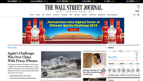 中国白酒在国际上崭露头角,问鼎国际权威大赛获得了国内外媒体如《华尔街日报》的争相报道。创刊于1889年的《华尔街日报》是全美付费发行量最大的财经报纸,作为美国的权威媒体,华尔街日报大篇幅报道了剑南春斩获“终极烈酒挑战赛”主席奖杯的新闻,报道从此次比赛的竞争激烈程度、评审权威程度等方面客观分析了赛事的含金量,并为剑南春取得如此高的成绩赞誉有加!