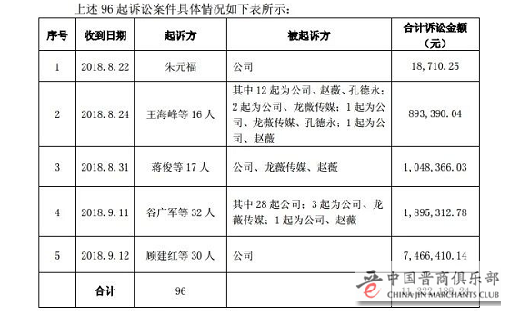 4月16日,祥源文化收到《中国证券监督管理委员会行政处罚决定书》,证监会对赵薇夫妇、赵薇胞兄、孔德永等人作出相关处罚。祥源文化在公告中表示,在8月22日至12日,祥源文化陆续收到法院《应诉通知书》,原告96名自然人以证券虚假陈述责任纠纷为由,分别向杭州市中级人民法院提起诉讼,要求祥源文化就前述信息披露违法行为承担民事赔偿责任,诉讼金额共计人民币1132.2万元。