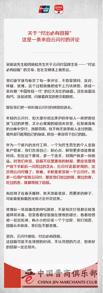 从上线“付出必有回报”最新品牌广告片,到联合21家银行推出“付出必有回报”品牌主张。也正是这句“付出必有回报”,近几天在网上引起网友的“积极讨论”,也可以说有些许的质疑和批评。甚至连互联网大拿吴晓波和“矮大紧”高晓松都参与了这场对峙,并积极的与大家“互动”。