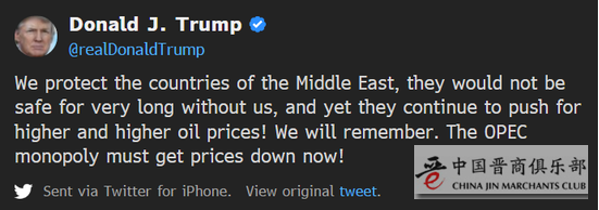 周四早间,特朗普在推特上表示OPEC这个垄断组织“现在必须降价!”特朗普在推特上表示:“我们保护了中东国家,如果没有我们,他们就没有长治久安,但他们继续推动油价越来越高!我们会记住。”