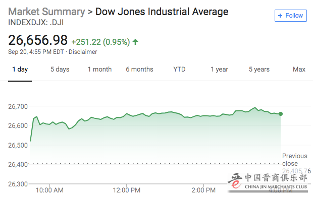 北京时间9月21日消息,投资者对国际贸易担忧形势缓解,美股全线收涨,道指涨逾250点携手标普同创历史收盘新高,特朗普在推特上盛赞标普500指数再创创历史新高,他表示“祝贺美国!”。