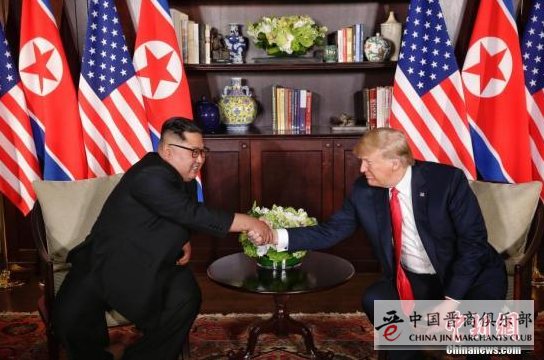 资料图:6月12日,朝鲜最高领导人金正恩(左)与美国总统特朗普在新加坡举行会晤。 中新社发 新加坡通讯及新闻部供图 摄