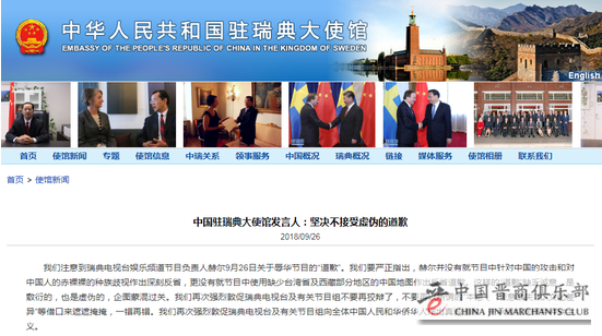 我们注意到瑞典电视台娱乐频道节目负责人赫尔9月26日关于辱华节目的“道歉”。我们要严正指出,赫尔并没有就节目中针对中国的攻击和对中国人的赤裸裸的种族歧视作出深刻反省,更没有就节目中使用缺少台湾省及西藏部分地区的中国地图作出反省道歉。这样的“道歉”缺乏诚意,是敷衍的,也是虚伪的,企图蒙混过关。我们再次强烈敦促瑞典电视台及有关节目组不要再狡辩了,不要再以所谓的“本意”、“表意缺失”和“文化差异”等借口来遮遮掩掩,一错再错。我们再次强烈敦促瑞典电视台及有关节目组向全体中国人民和华侨华人作出真诚道歉,并承诺彻底摒弃种族主义。