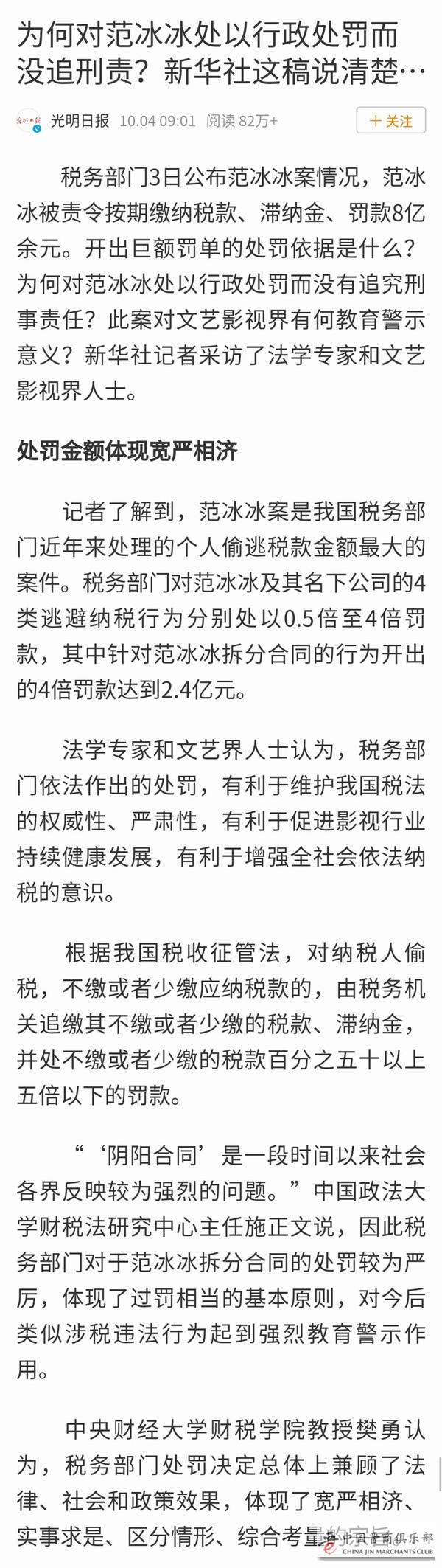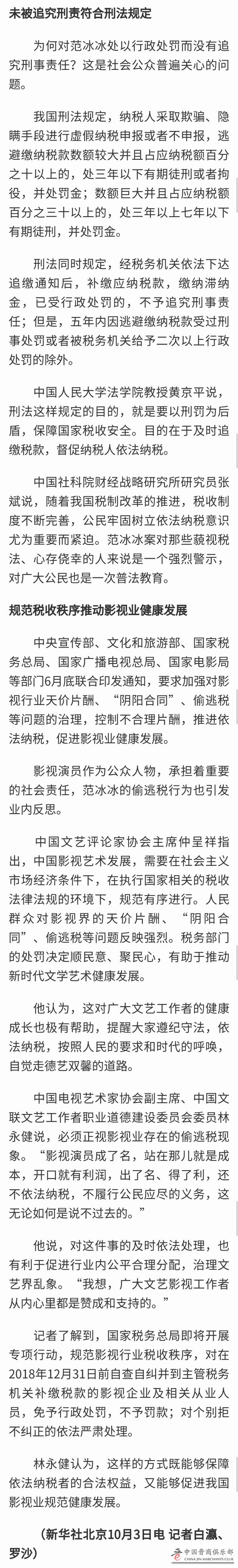《光明日报》有篇文章“为何对范冰冰处以行政处罚而没追刑责?新华社这稿说清楚了”(后附全文),详细说明了范冰冰为何只被追究行政处罚,而不是刑事处罚。