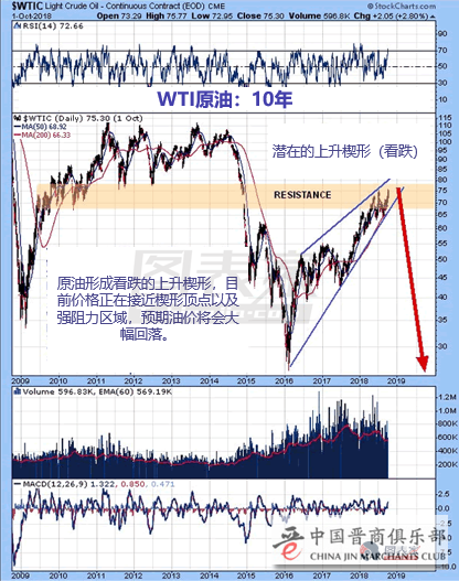 其四,从WTI原油近十年的表现来看,价格可能正在接近看跌的上升楔形的顶点,该水平也是处于强阻力区域之中。这些因素暗示价格可能跌破楔形下轨并大幅走低。