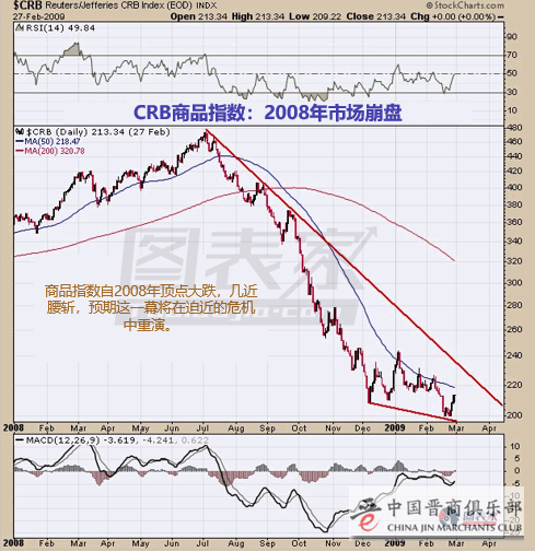 首先,从CRB商品指数在2008年市场崩盘期间的表现来看,价格在2008年期间近乎腰斩,跌势甚至延续至2009年。Maund预期在下一轮危机中商品指数将重现这一走势,甚至更糟。