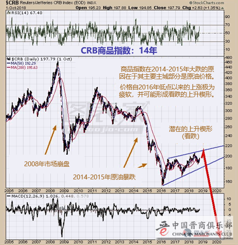 其次,原油是CRB商品指数的重要组成部分,在2008年期间WTI原油大跌,若历史重演,原油价格或再度下行。