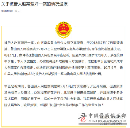 审查起诉期间,鲁山县人民检察院官微9月19日对该案进行了公开报道。但该案涉及未成年人及隐私,办案程序尚在进行,此间进行报道是错误的,并且报道中多处表述错误、用语明显不当,造成十分不良的社会影响。我院已责成鲁山县人民检察院认真整改,吸取教训。感谢和欢迎社会各界对检察工作的监督支持!
