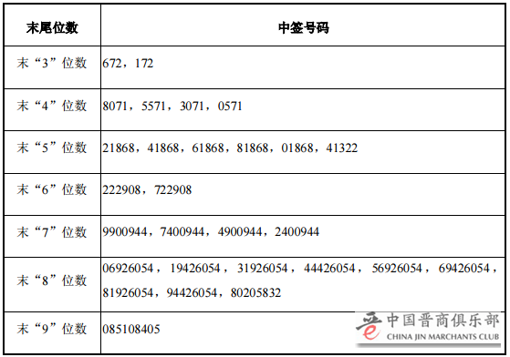天风证券中签结果出炉,中签号码共有46.6万个,每个中签号码只能认购1,000股。末“3”位数:672、172;末“4”位数:8071、5571、3071、0571;末“5”位数:21868、41868、61868、81868、01868、41322;末“6”位数:222908、722908;末“7”位数:9900944、7400944、4900944、2400944;末“8”位数:06926054 、19426054 、31926054 、44426054、56926054 、69426054 、81926054、94426054、80205832;末“9”位数:085108405。