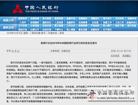 以下为2018年10月14日发布在中国人民银行官网的《易纲行长在2018年G30国际银行业研讨会的发言及答问》内容全文: