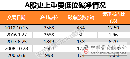 至于另一个重要低点2638点(2016年1月27日),其即是2015年大熊市的阶段低点,也是2016年初的“熔断”低点,当时A股只有50只个股破净,占交易个股比为1.96%。