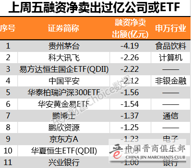 另有863只个股被融资净卖出,其中有11只个股被净卖出超过1亿元,贵州茅台排在首位,净卖出额为4.19亿元,其次是科大讯飞,被融资净卖出2.26亿元。