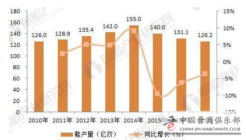 2010-2017年我国鞋产量(单位:亿双,%)。来源:前瞻产业研究院