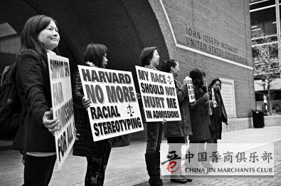 核心提示:哈佛大学被控多年来在招生过程中蓄意歧视亚裔申请学生,位于波士顿的美国联邦地区法院15日开庭审理此案,引发全美关注。图为抗议者在美国联邦地区法院前展示标语牌。