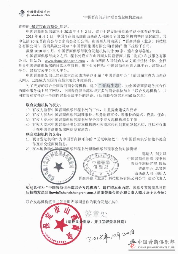 2018年10月20日,中国晋商俱乐部秘书处收到了保定市山西商会的正式回执,保定市山西商会确认加盟为中国晋商俱乐部联合发起机构。