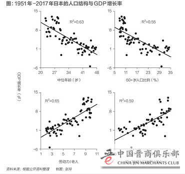 劳动力(尤其是15岁-39岁人口)是驱动经济的动力(生产、消费、创新),老年化则是阻力。比较日本和欧洲各国的人口结构和经济增长率,发现随着中位年龄和60+岁人口比例的提高、劳动力/老人(20岁-64岁/65+岁)和15岁-39岁人口比例下降,经济增长率直线下降。