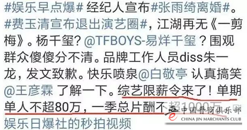 所以这也是他们对于自己的保护,而也是在今年的娱乐圈中一点都不太平,首先就是天价片酬的问题,然后就被整顿了。接下来就是电影行业的收视率造假,现在连综艺节目以及真人秀,都出台了相应的整理措施,那么其中最让人关注的也就是明星们的片酬问题了。当然对于艺人的薪水片酬的限制,这也是网友最为关注的一点。