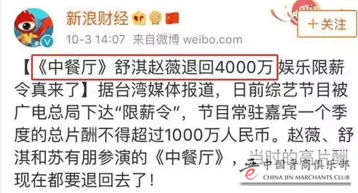 而在最新的“综艺限薪令”的规定中,艺人们参加节目录制的单人费用单期不得超过80万,而且录制的一季节目片酬不能超过1000万。然而明星们实际上参加的录制片酬远远高于这个数,因此也是在娱乐圈中掀起了小规模的“退薪潮”那么也是在之前热播和录制当中的综艺《中餐厅》中,也是对艺人出现了“限薪令”推出了标准,并且其中舒淇和赵薇两个人的片酬比1000万还多出了4000万,那么就因此规定要退4000万片酬。