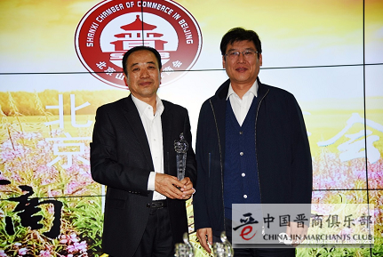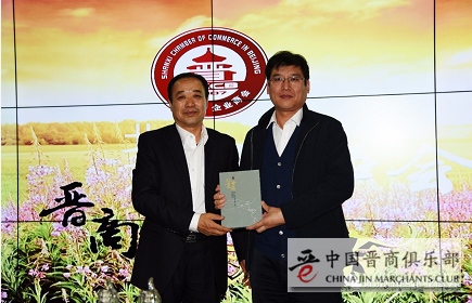 韩智丰董事长代表商会向王建强局长赠送《北京晋商故事》一书。