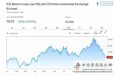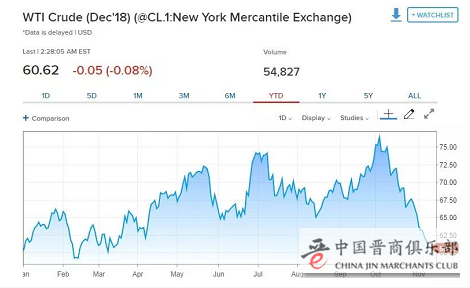 2018年以来,油价一路飙涨,并在10月初创下四年新高,布伦特原油一度冲破86美元/桶,WTI原油最高接近77美元/桶。但在沙特记者遇害案发生后,油价开始走跌。10月以来,油价从10月3日的最高点已经下跌了近20%,正式进入熊市。
