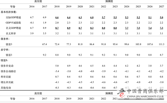 表22016—2027年债务率和赤字率动态路径和贡献分解(情景2)