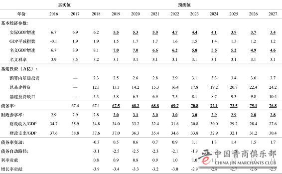 其二,合理安排未来的预算内基础设施建设支出规模,保持必要的基建规模的同时,尽可能地降低政府真实债务负担。下面我们估算了未来十年两种情境下的赤字率和债务率,以及相关宏观经济指标的变化。
