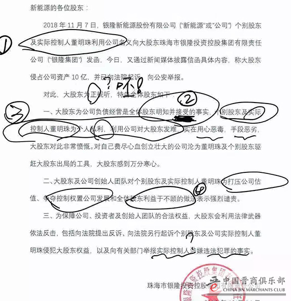 11月13日,银隆新能源通过官方微信公众号发布《致银隆新能源股份有限公司各股东的函》称,公司新一任董事会、监事会及公司管理层在履职过程中,发现原董事长魏银仓、原总裁孙国华涉嫌通过不法手段,侵占公司利益金额超过10亿。目前,公司已向珠海市中级人民法院提起民事诉讼、珠海市公安局经侦支队进行报案,相关机构已正式受理。