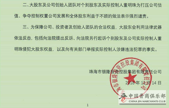 近日,银隆新能源股份有限公司(以下简称“银隆新能源”)一纸声明,将原董事长魏银仓与二股东董明珠之间的恩怨摆在了聚光灯下。随着银隆新能源连发两份声明指责魏银仓等人侵占公司财产,11月14日下午,疑似银隆新能源大股东珠海市银隆投资控股集团有限责任公司(以下简称“银隆控股”)也对外发布了《致银隆新能源全体股东的函》,函中直指董明珠是银隆新能源的“实际控制人”,称个别股东及董明珠利用公司对大股东发难,“用心恶毒”。