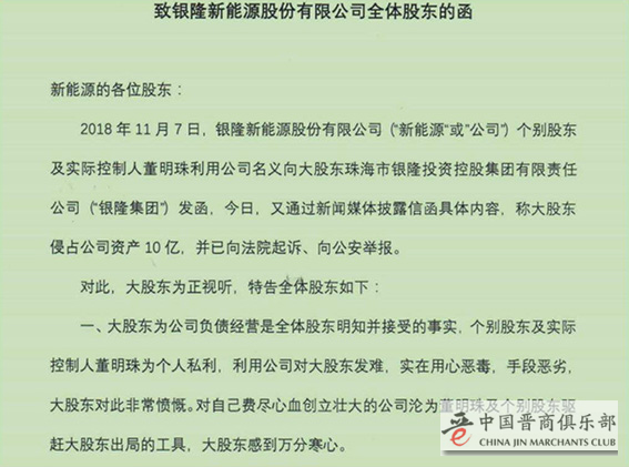 网络流传的银隆控股致银隆新能源全体股东的函。