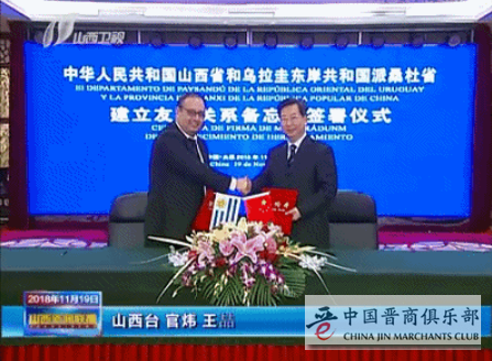 11月19日上午,省长楼阳生在太原会见了乌拉圭东岸共和国派桑杜省省长吉列尔莫·卡拉瓦略一行,并签署建立友好关系备忘录。