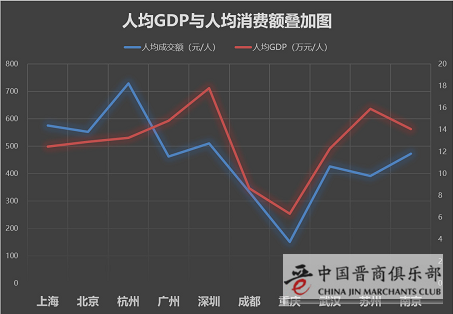 综合各城市GDP与人均收入数据可以发现,2017年GDP前十名的城市与今年天猫双11成交额(GMV)前十名城市高度重合,也有“异常”数字:GDP排名第6的天津并未进入GMV前十,反倒是GDP排名第11的南京进入GMV前十。
