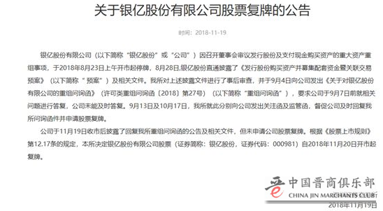 公司于11月19日收市后披露了回复深交所重组问询函的公告及相关文件,但未申请公司股票复牌。根据《股票上市规则》第12.17条的规定,深交所决定银亿股份自2018年11月20日开市起复牌。