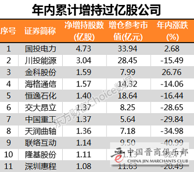 而净增持超过1亿股的公司有11家,其中仅金科股份和国投电力年内是上涨的,涨幅也仅有26.76%和2.68%。其余9家公司则都是下跌的,且跌幅均超过10%,联络互动跌幅更是达到40.99%。