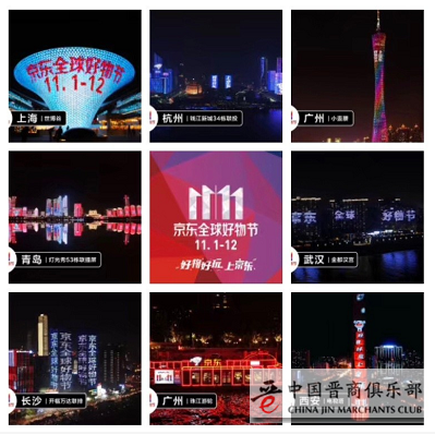 和烟花秀一同进行的,还有城市地标秀,上海、广州、武汉、杭州等城市的地标相继被京东11.11点亮。在TVC《来京东》中,伴随着炫酷的BGM,年轻男女们喊出了今年的slogan“好物好玩,上京东”。