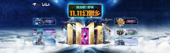 京东还与中国最大的年轻人交流平台——B站合作,在11月1日-11日期间,落地以“11.11幻想乡”为主题的minisite。而B站也首次上线弹幕广告功能,并且把第一次投放开放给了京东——11.1超级秒杀日这天,京东以秒杀为主题的弹幕广告,出现在了B站最火圈层。
