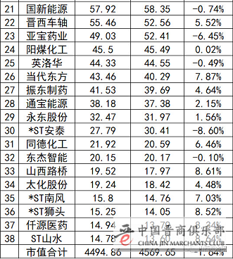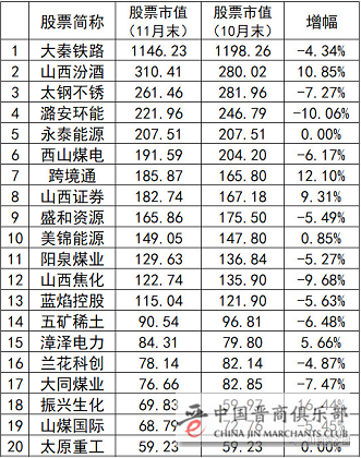 以下为山西辖区A股上市公司2018年10月末市值排名和变动情况: