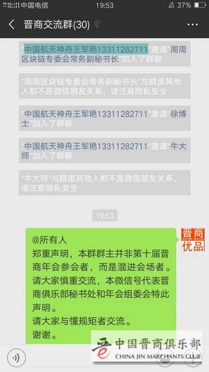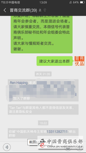 在12月16日会议现场,微信号为 Ren Haiping与中国航天神舟王军艳13311282711 在现场扰乱会议活动,并且在晚宴是混入现场,与参会者合影、加微信以及单独拉所谓“晋商交流群”。