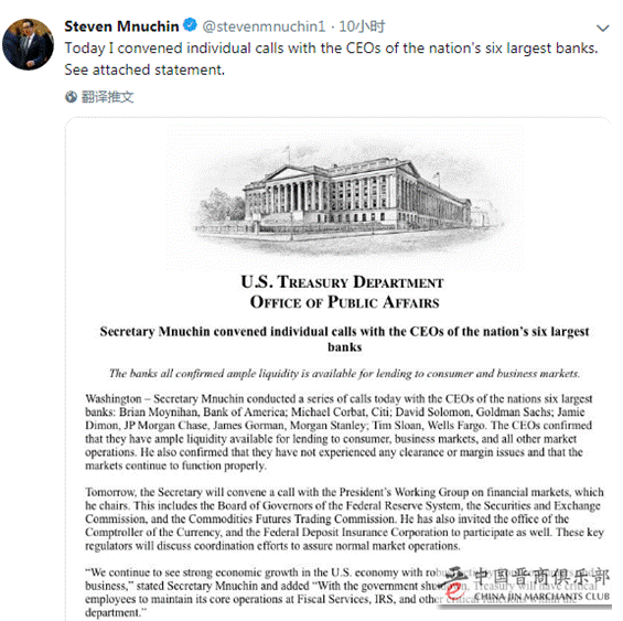 努钦23日下午发布推文称,他给美国最大六家银行的首席执行官打过电话,这些首席执行官“确认他们有充裕的流动性,可用于向消费者、商业市场和所有其他市场运作提供贷款。”