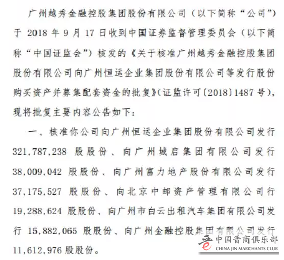 当时,越秀金控拟以12.99元/股的发行价格,向广州恒运、广州城启、广州富力、北京中邮、广州白云、广州金控合计发行约4.44亿股,同时向广州恒运支付5亿元现金,合计作价约62.6亿元。