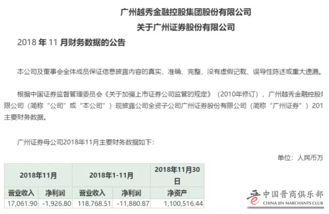 根据越秀金控12月初披露的数据,2018年11月,广州证券营业收入约1.71亿元,净亏损1926.8万元;而2018年前11月,广州证券营收约11.88亿元,净亏损1.19亿元。截至11月末,广州证券净资产约110亿元。
