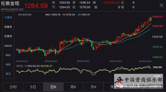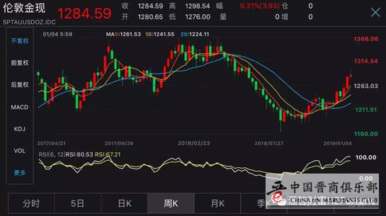上周一至周五早盘,金价震荡上行,伦敦现货金价最高涨至1298.54美元/盎司,离1300咫尺之遥,此后,由于美元走强,金价回落,收盘于1284.74美元,周涨幅0.32%。